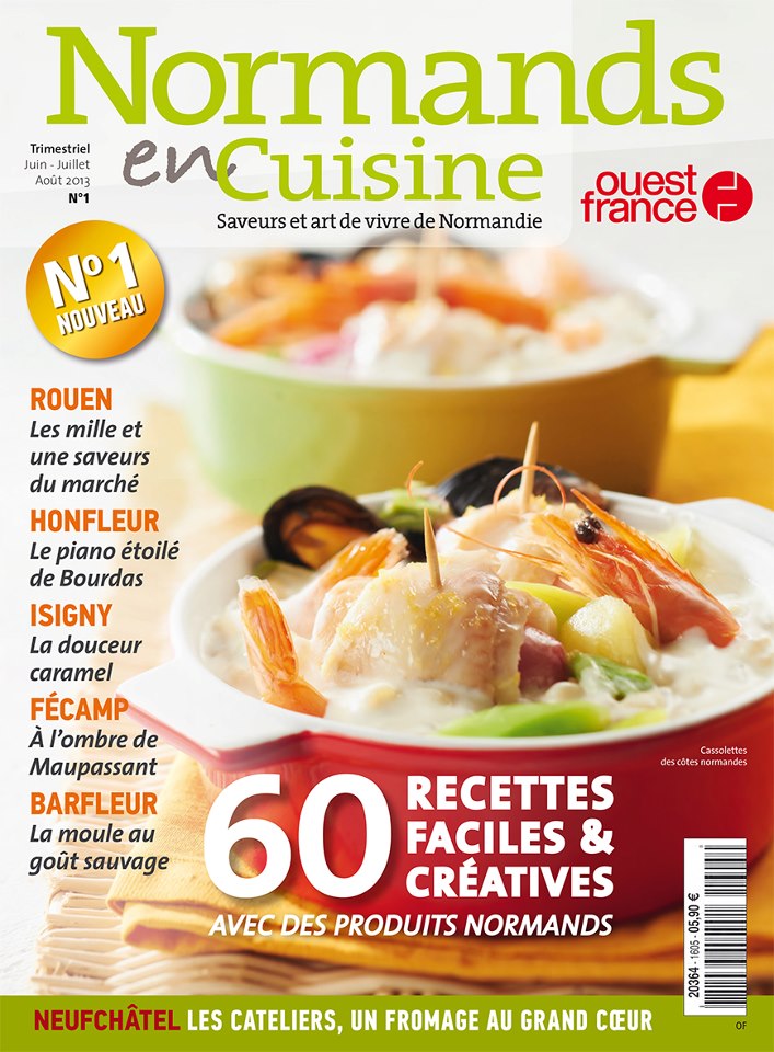 - Pour ce premier numéro, 60 recettes avec des produits de Normandie : caviar de carotte de Créances à l’orange, poiré de Domfront, sucettes de chèvre aux éclats de caramel d’Isigny, brochette de moules croustillantes, …